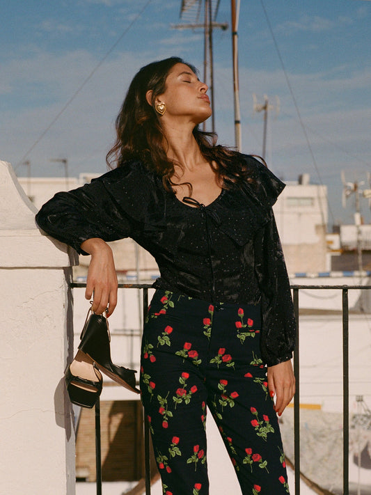 Top Noir Élégant | Volants & Fluide | Soirées & Dîners Romantiques