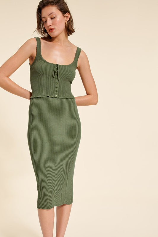 Jupe Midi | Kaki En Maille Côtelée | Moderne Et Féminine | Pour L’Automne Et Mi-Saison