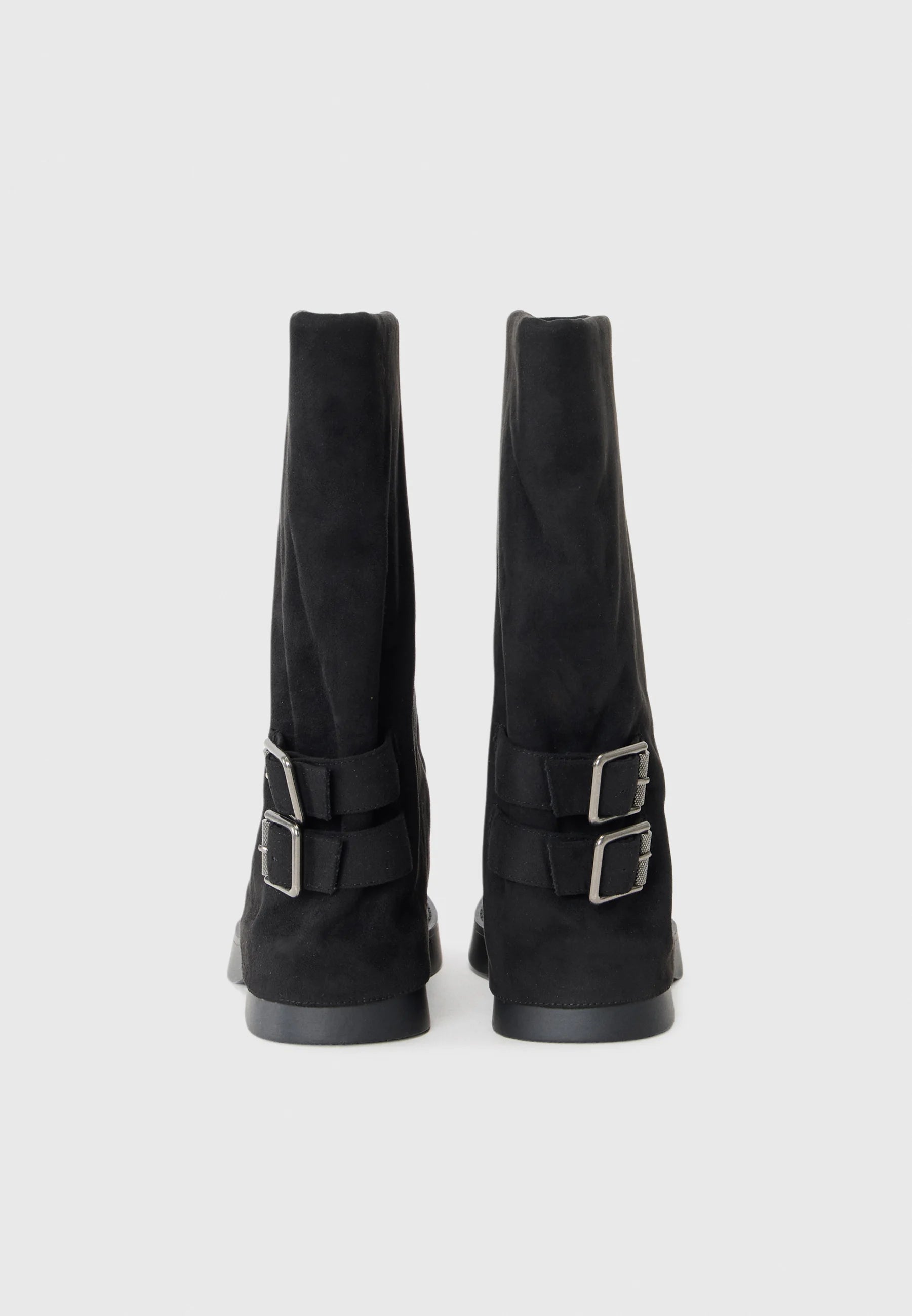 Ces bottes en suédine noire au design drapé et à boucles latérales combinent modernité et élégance. Fabriquées en cuir synthétique de haute qualité, elles sont idéales pour un look audacieux sans compromis sur le confort.