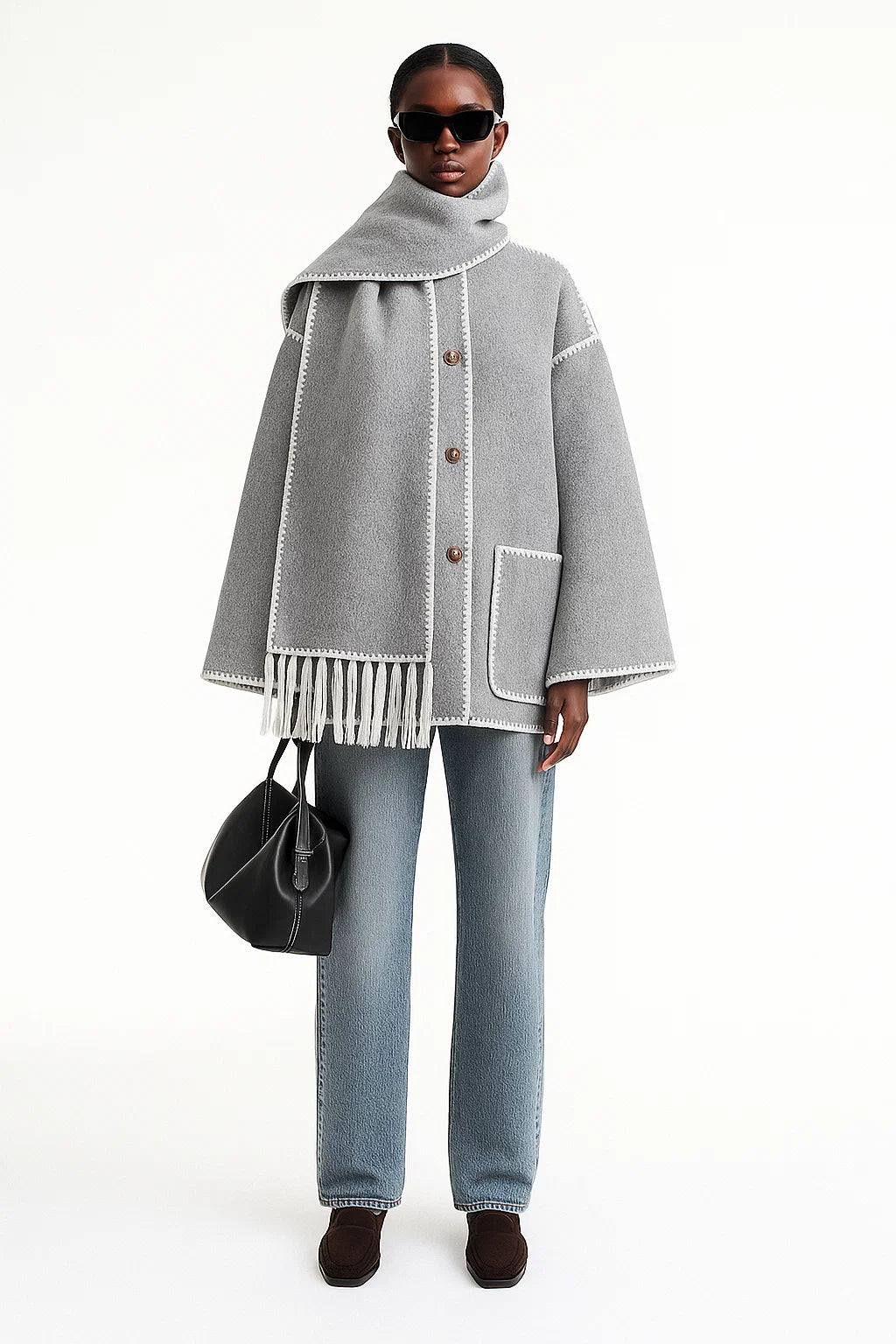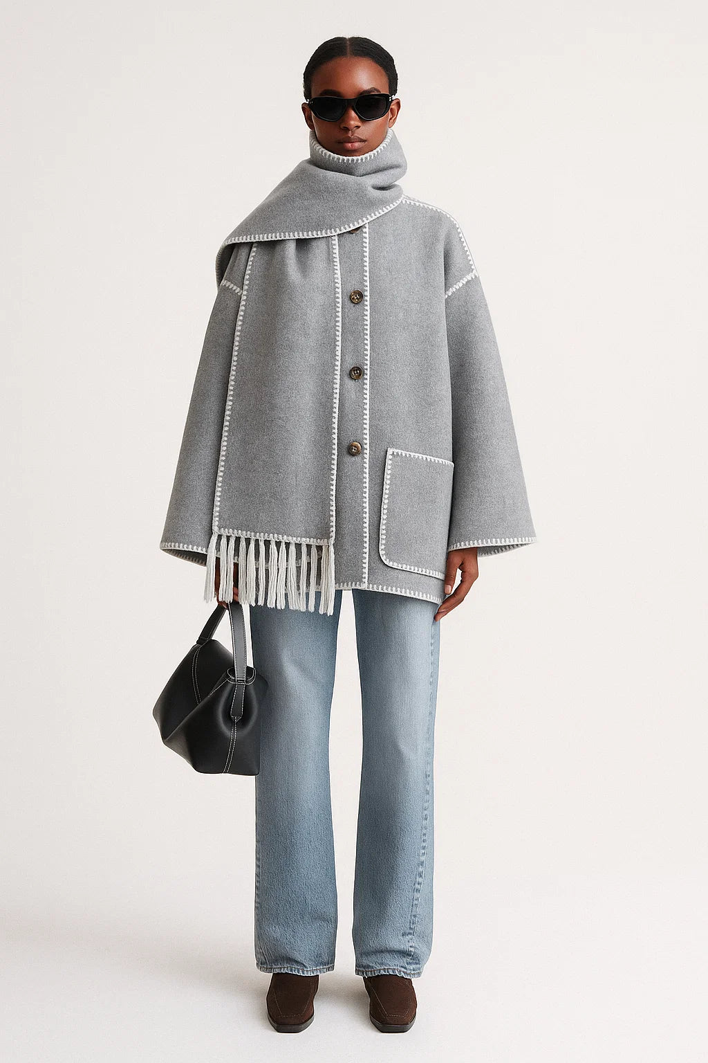 Cette cape noire structurée, ornée de bordures contrastantes et d’une finition frangée, mêle confort et sophistication. Sa coupe ample permet de la superposer facilement sur vos tenues habillées ou décontractées.