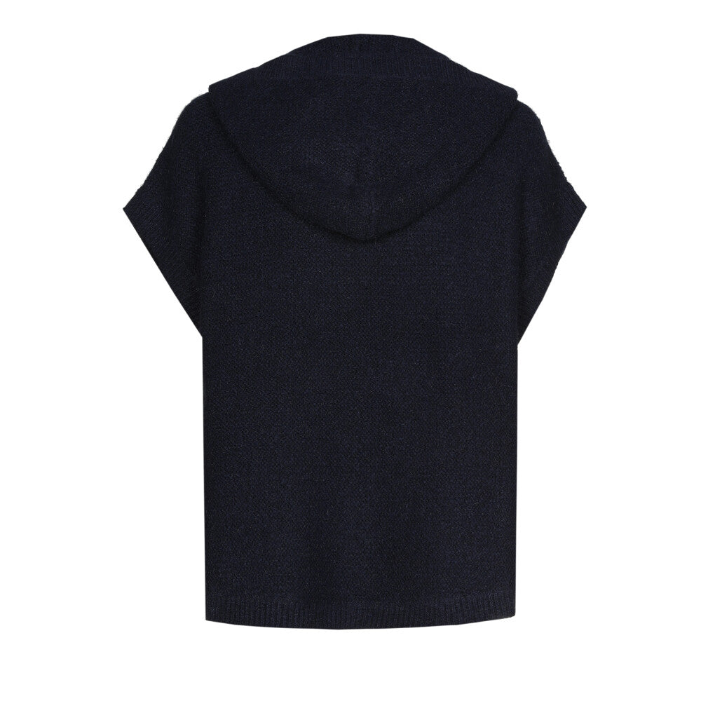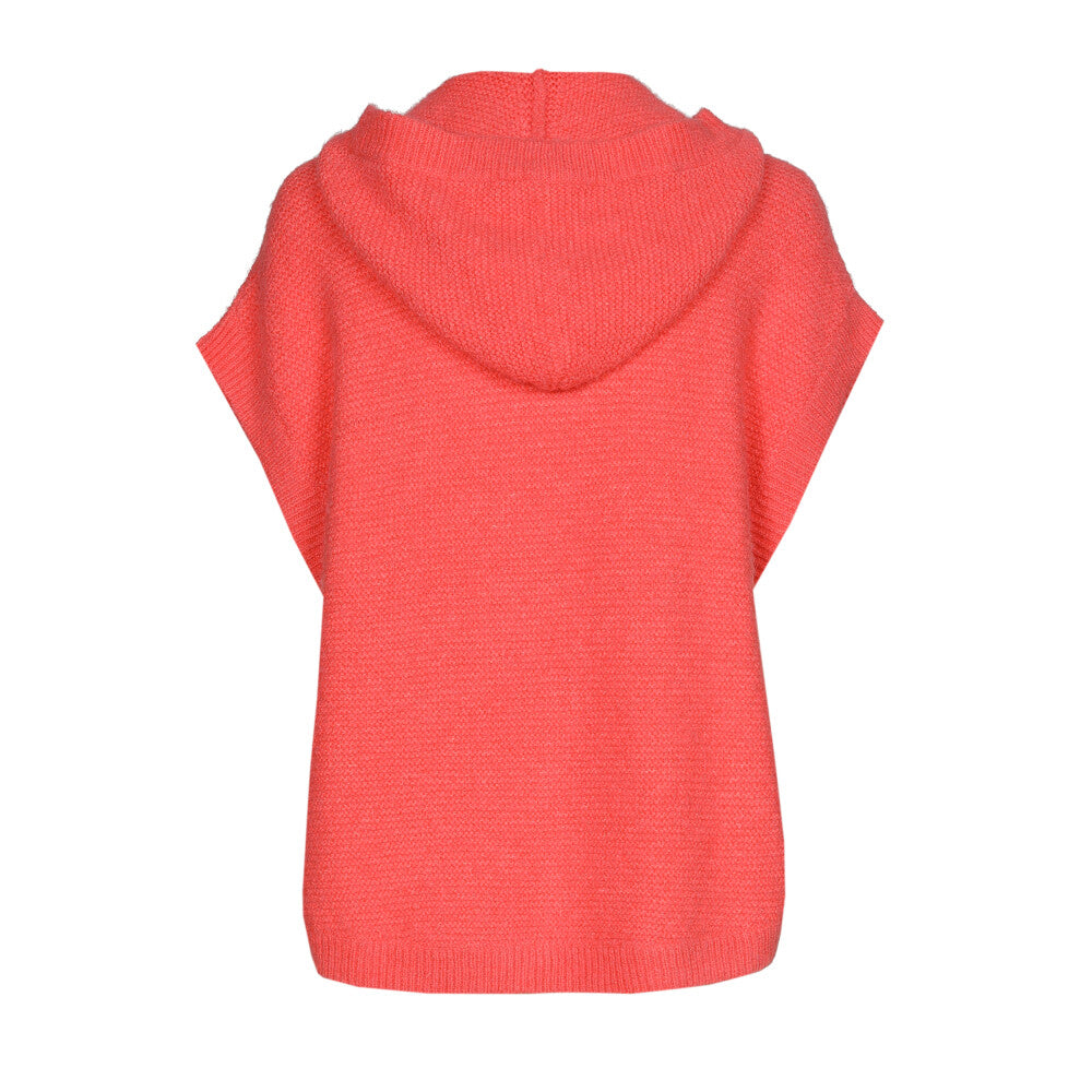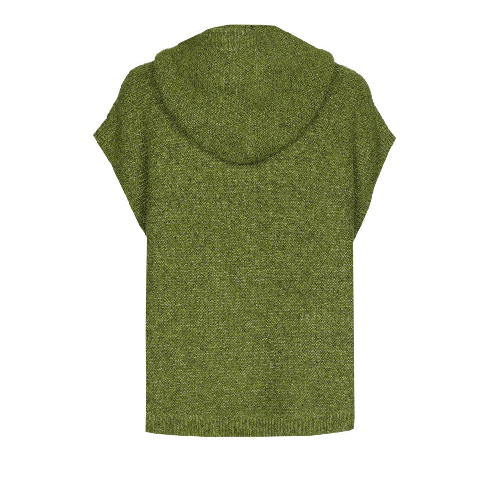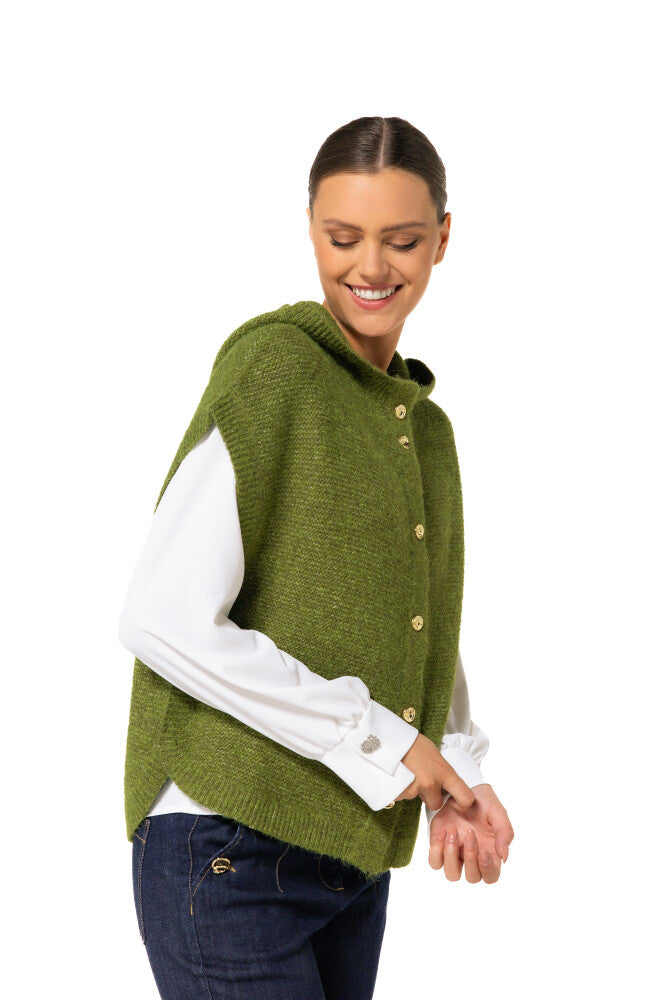 Cette cape sans manches en maille verte, boutonnée et à capuche est idéale pour la mi-saison. Elle combine chaleur légère, liberté de mouvement et style casual affirmé.