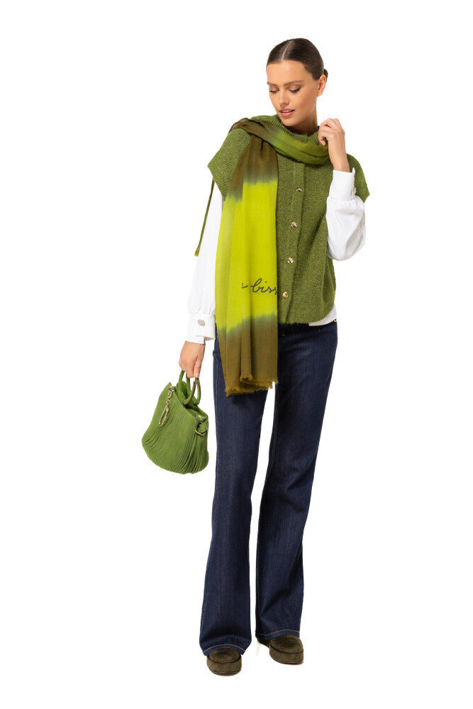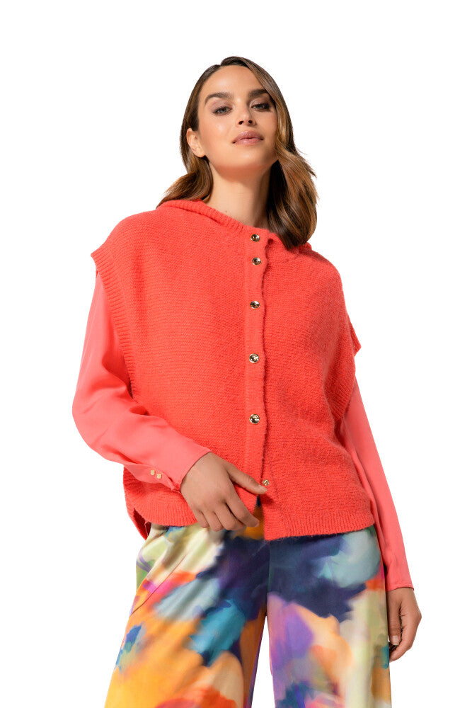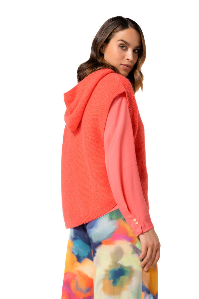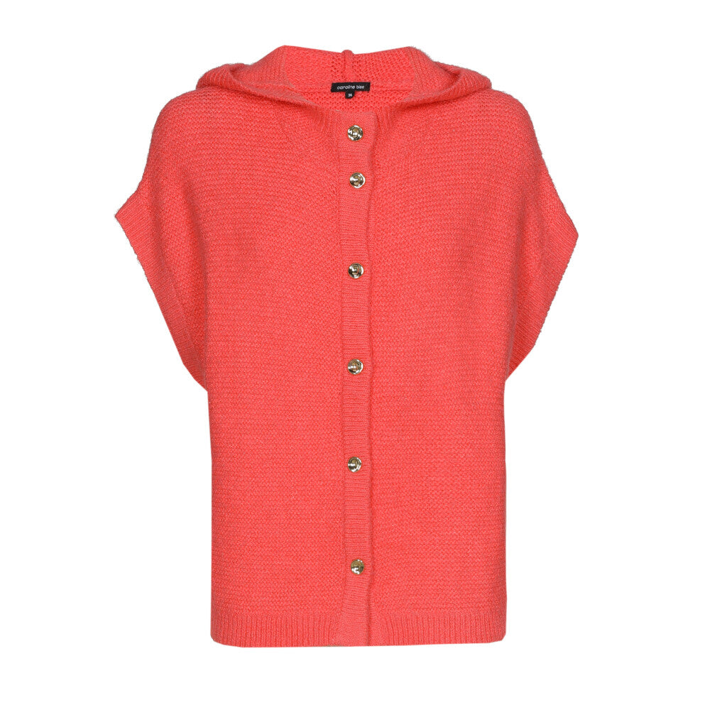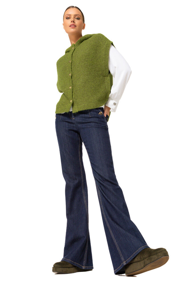 Cette cape sans manches en maille verte, boutonnée et à capuche est idéale pour la mi-saison. Elle combine chaleur légère, liberté de mouvement et style casual affirmé.