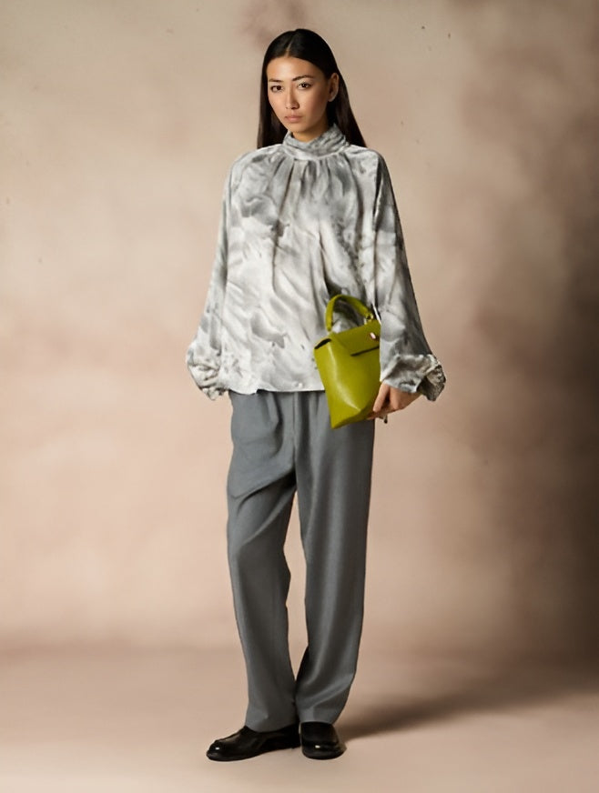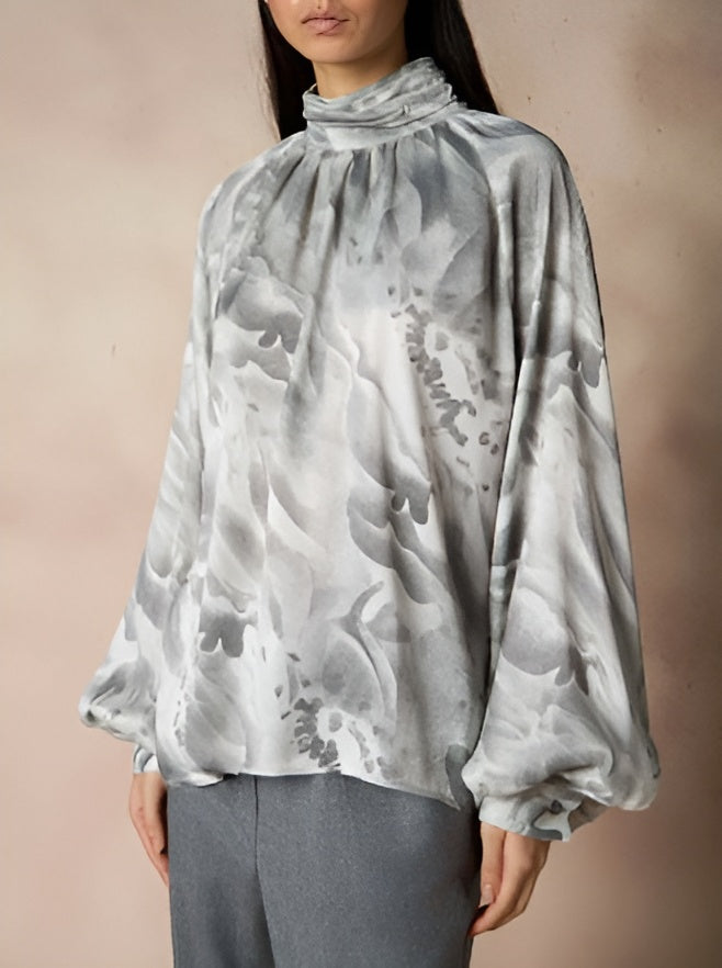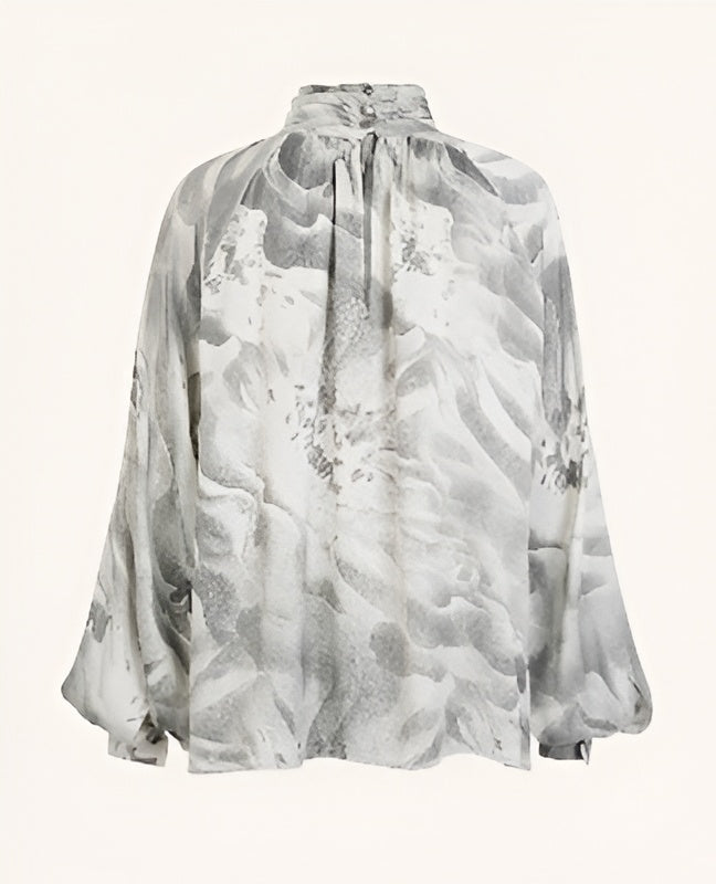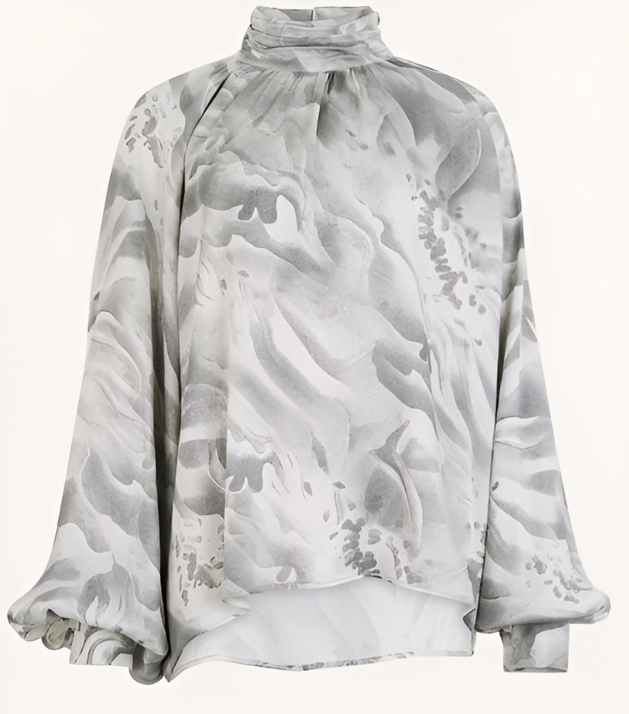Ce chemisier fluide offre une silhouette raffinée grâce à ses manches amples et son col montant délicat. Son imprimé abstrait dans des tons doux apporte une touche artistique et moderne à votre tenue.