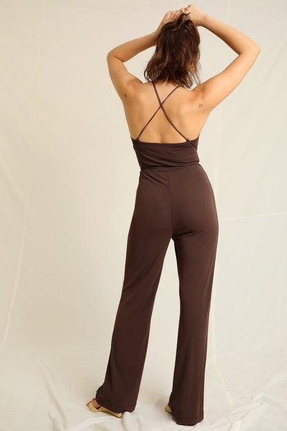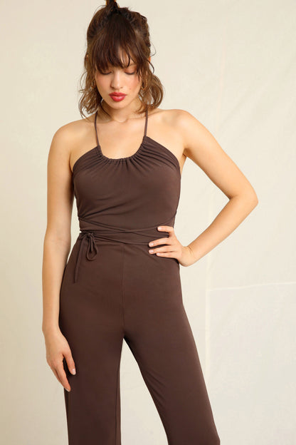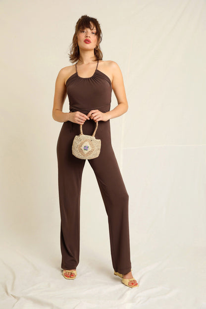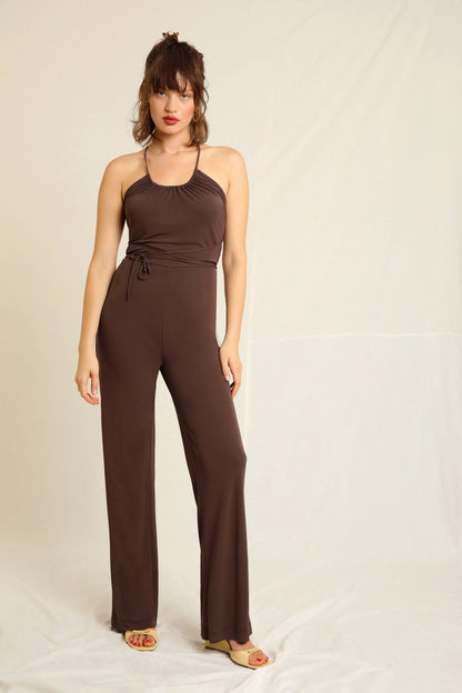 Cette combinaison dos-nu à la coupe fluide met en valeur la silhouette tout en offrant une liberté de mouvement. Son tissu doux et sa taille ajustée en font une pièce chic et féminine.