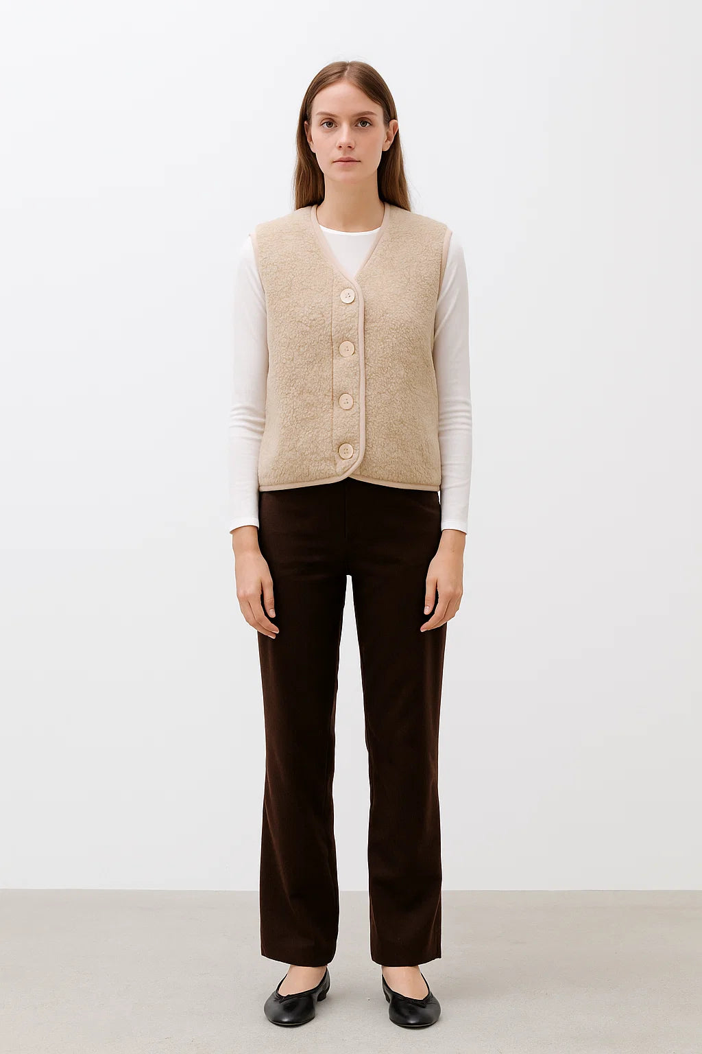 Ce gilet sans manches en 100% laine est parfait pour garder le buste bien au chaud tout en laissant une grande liberté de mouvement. Avec ses jolis boutons en bois et sa texture douce, il s’adapte facilement à toutes les tenues.