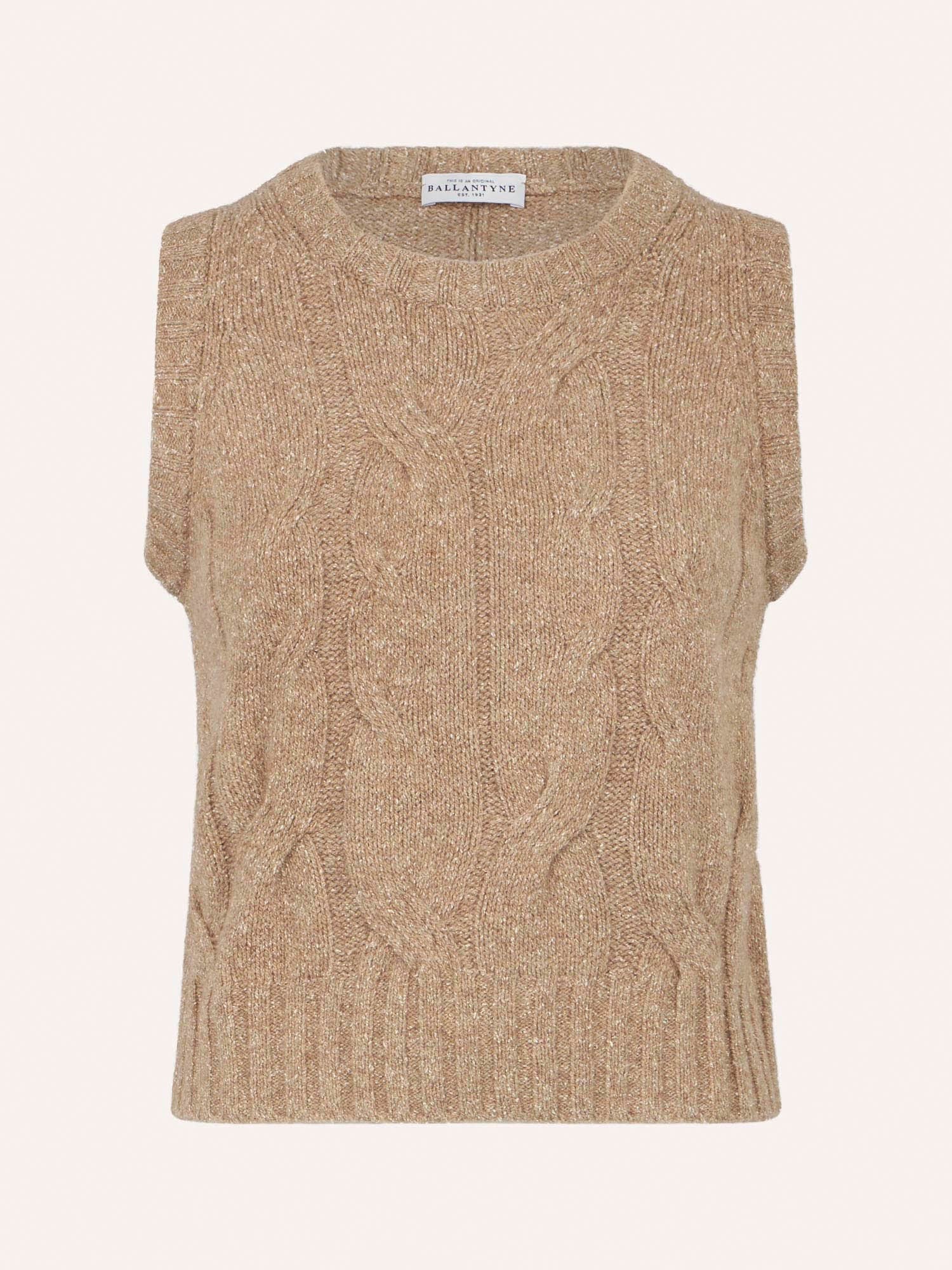 Ce gilet sans manches en laine et soie allie douceur, chaleur et raffinement avec son tricot torsadé classique. Facile à porter sur une chemise ou un col roulé, il apporte une touche preppy et sophistiquée à votre tenue.