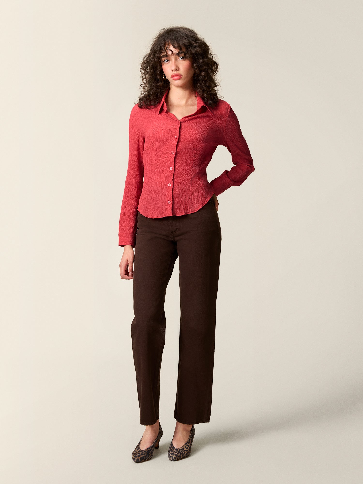 Ce jean 100% coton mise sur une coupe droite légèrement raccourcie et une taille haute flatteuse. Sa teinte marron profonde ajoute une touche d’originalité tout en restant sobre et chic.