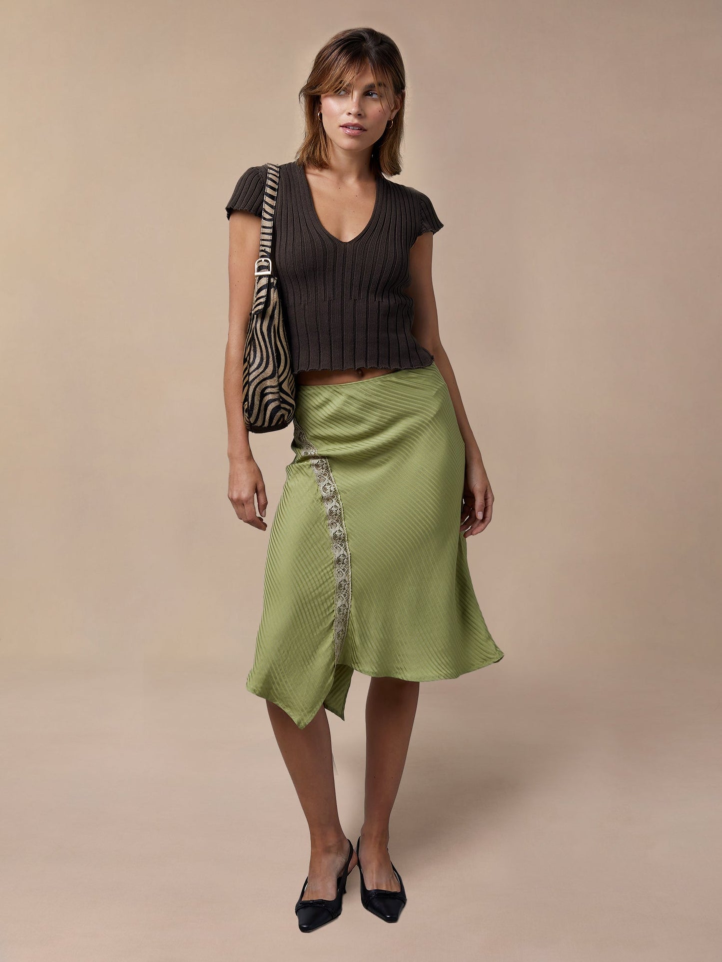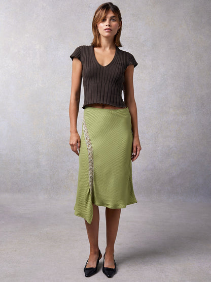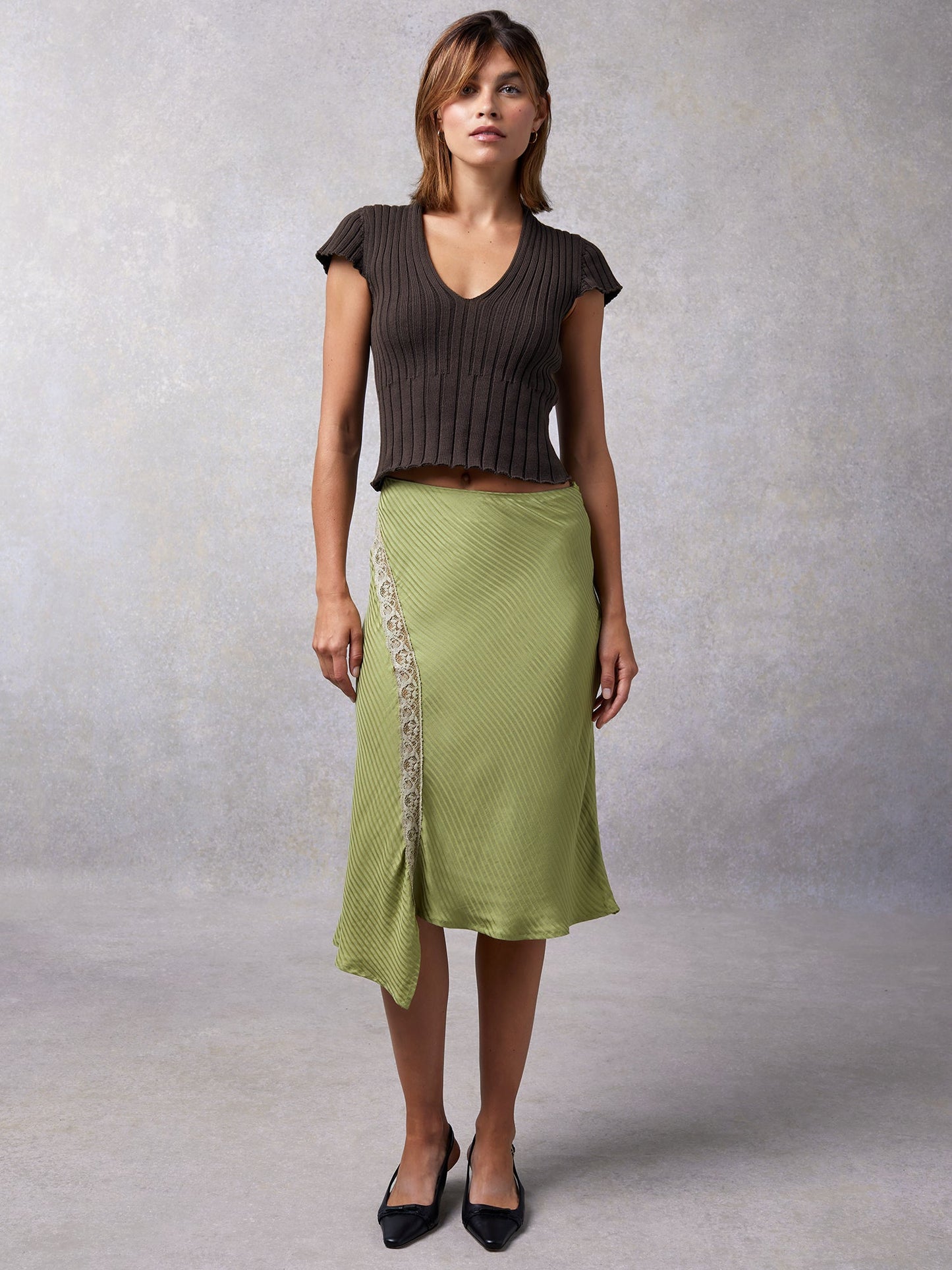 Jupe Midi | Satinée Verte Avec Dentelle | Élégante Et Fluide | Idéale Pour Les Soirées