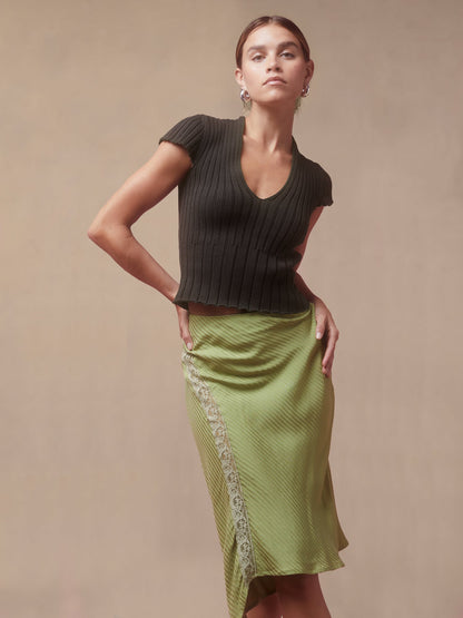 Cette jupe midi satinée vert clair avec détail en dentelle sur le côté offre une allure raffinée et séduisante. Sa matière fluide et son tombé soyeux apportent féminité et confort.