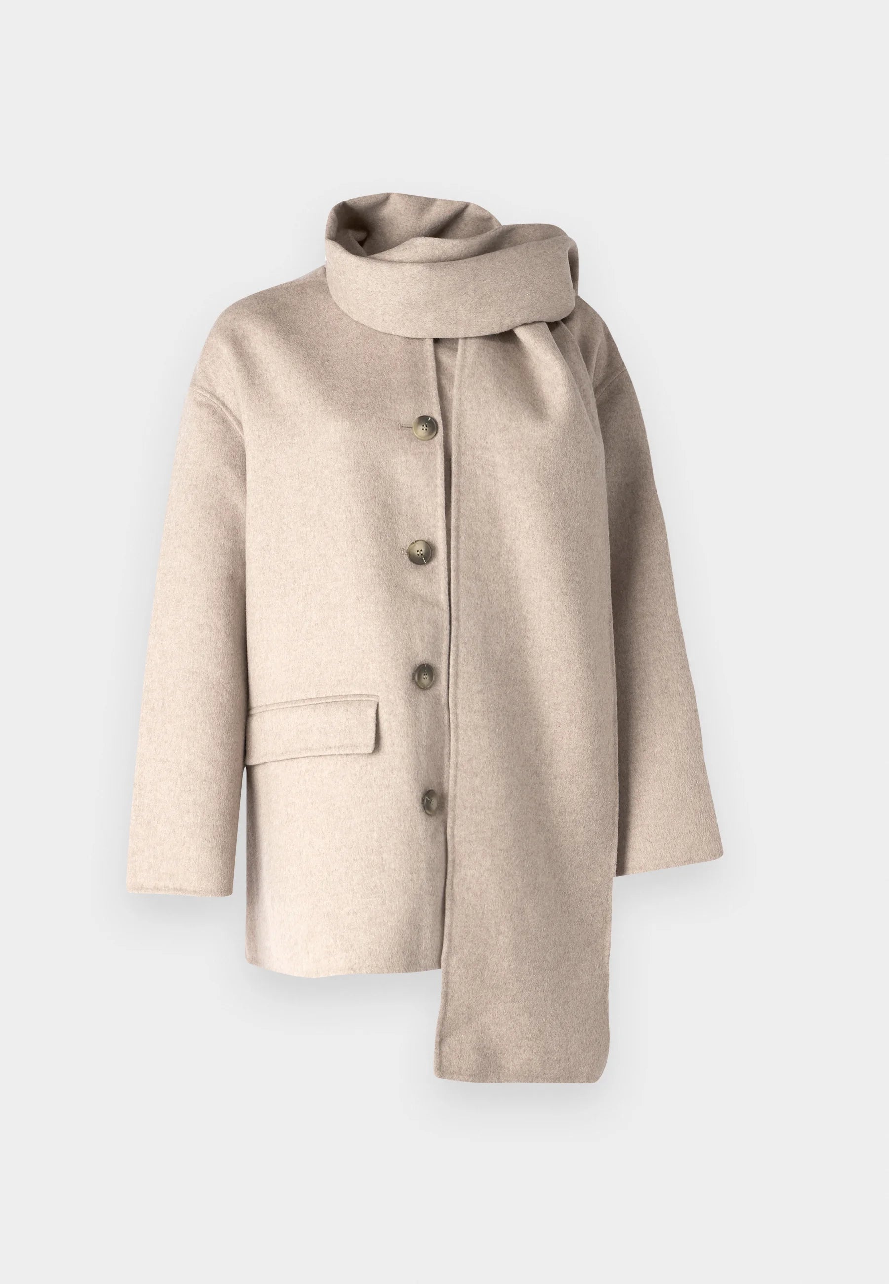 Ce manteau court en laine mélangée, couleur beige clair, offre un équilibre parfait entre confort et raffinement. Sa coupe droite rehaussée d’un col montant intégré façon écharpe apporte une touche sophistiquée et pratique.