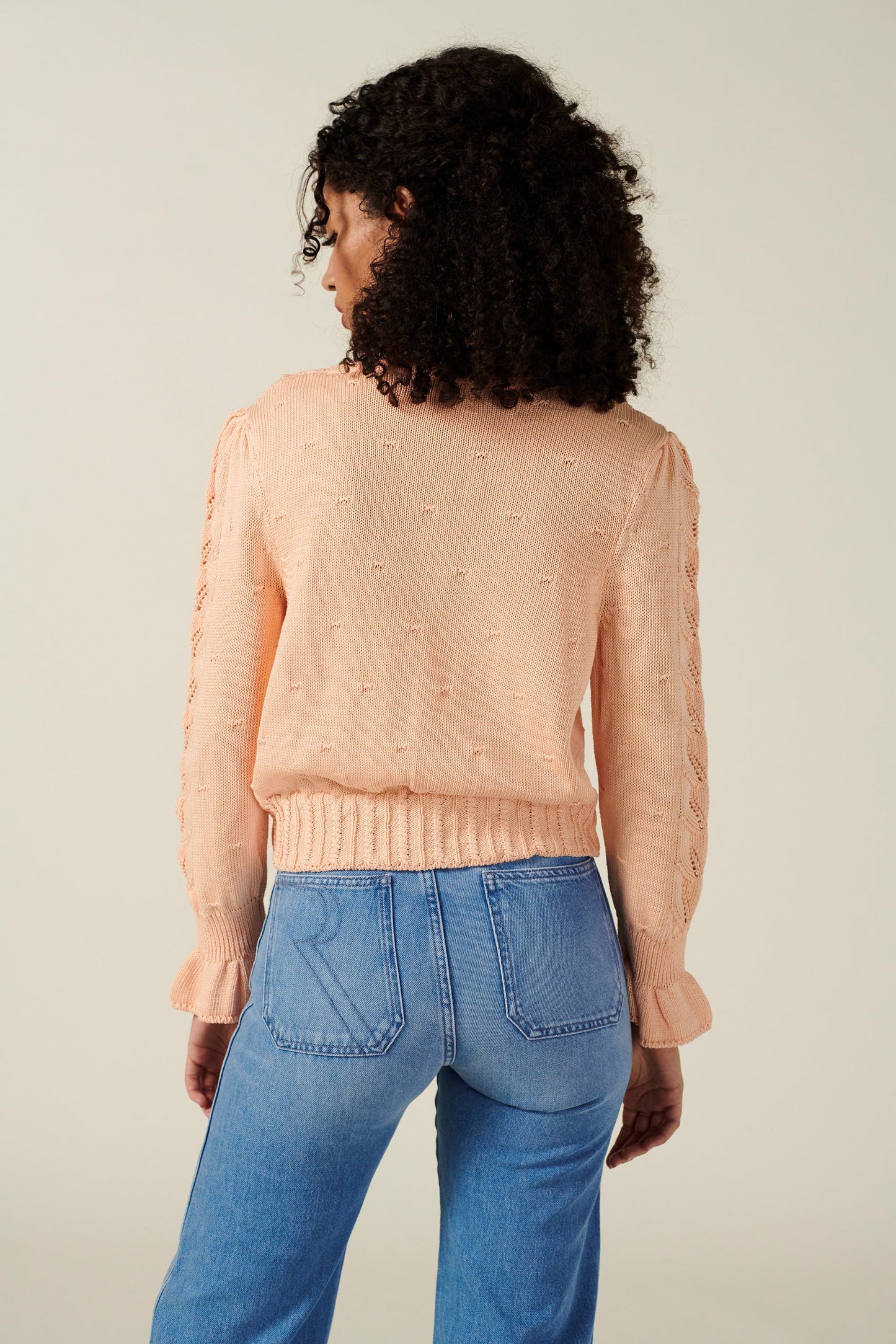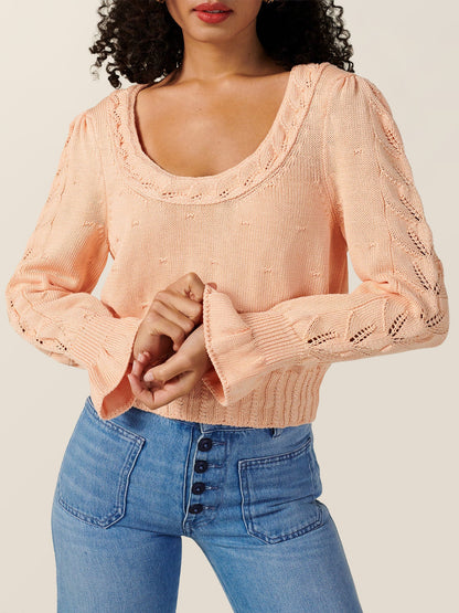Ce pull en maille ajourée à manches longues et encolure ronde apporte douceur et élégance à vos tenues quotidiennes. Sa coupe courte et ses détails ajourés le rendent parfait pour un style moderne et raffiné.