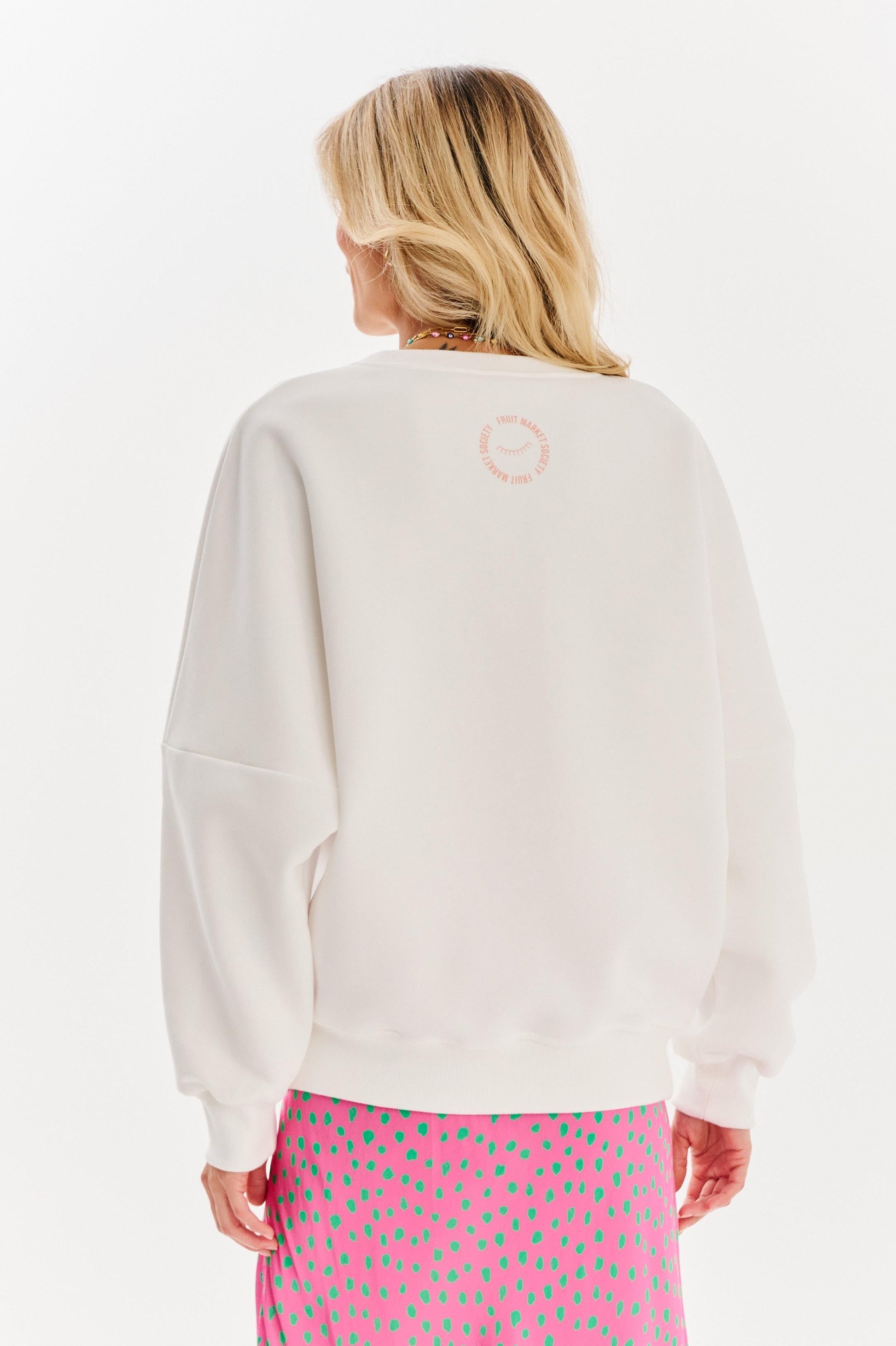 Ce sweat blanc à imprimé pêche apporte une touche fruitée, fraîche et joyeuse à votre tenue. Confortable et stylé, il se marie parfaitement avec une jupe fluide ou un pantalon coloré.