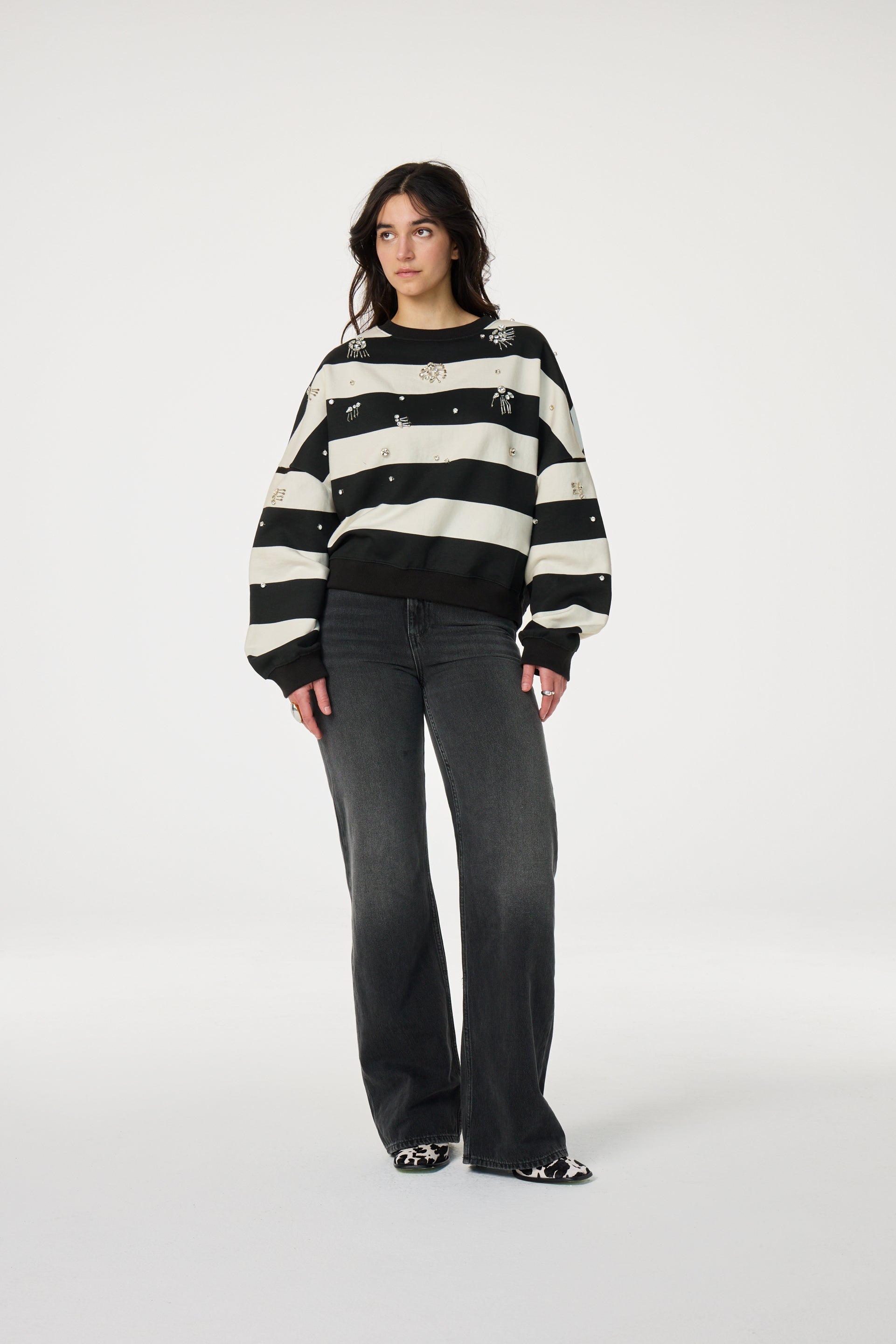 Sweater En Coton Biologique | Rayures Noires Et Blanches | Coupe Ample Et Manches Bouffantes | Parfait Pour Un Look Décontracté