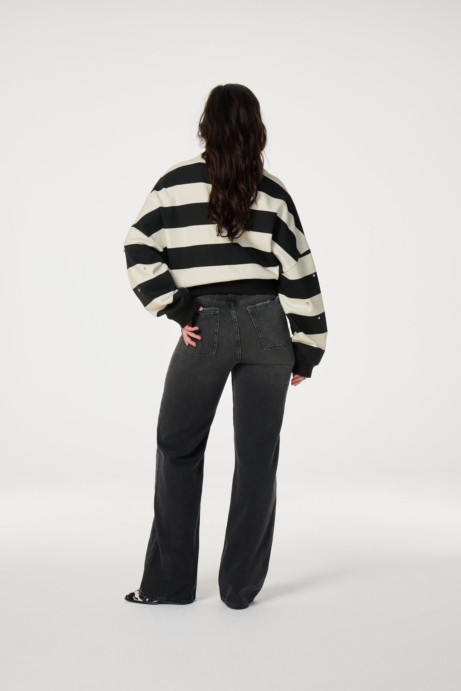 Ce pull à rayures noires et blanches allie style urbain et confort, parfait pour une allure cool et décontractée. Sa coupe ample et ses manches légèrement bouffantes en font une pièce forte et facile à porter.