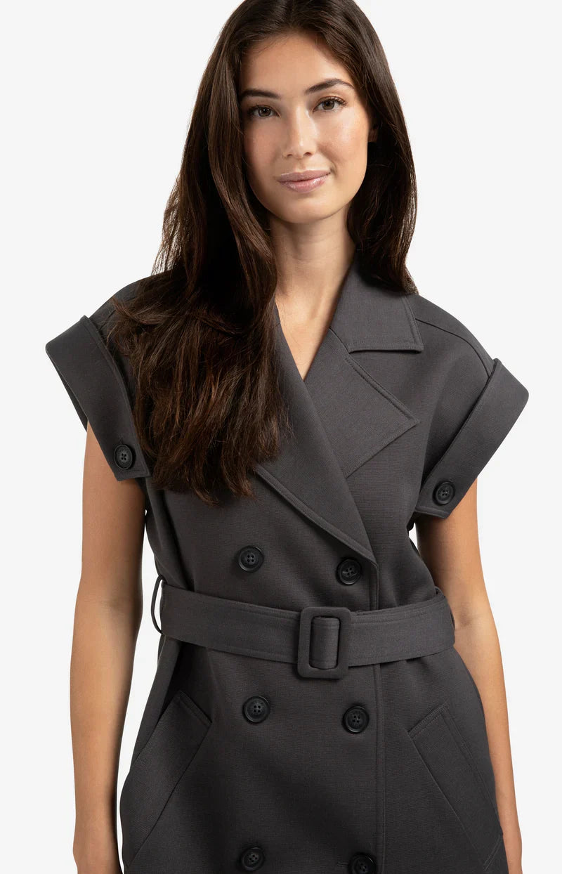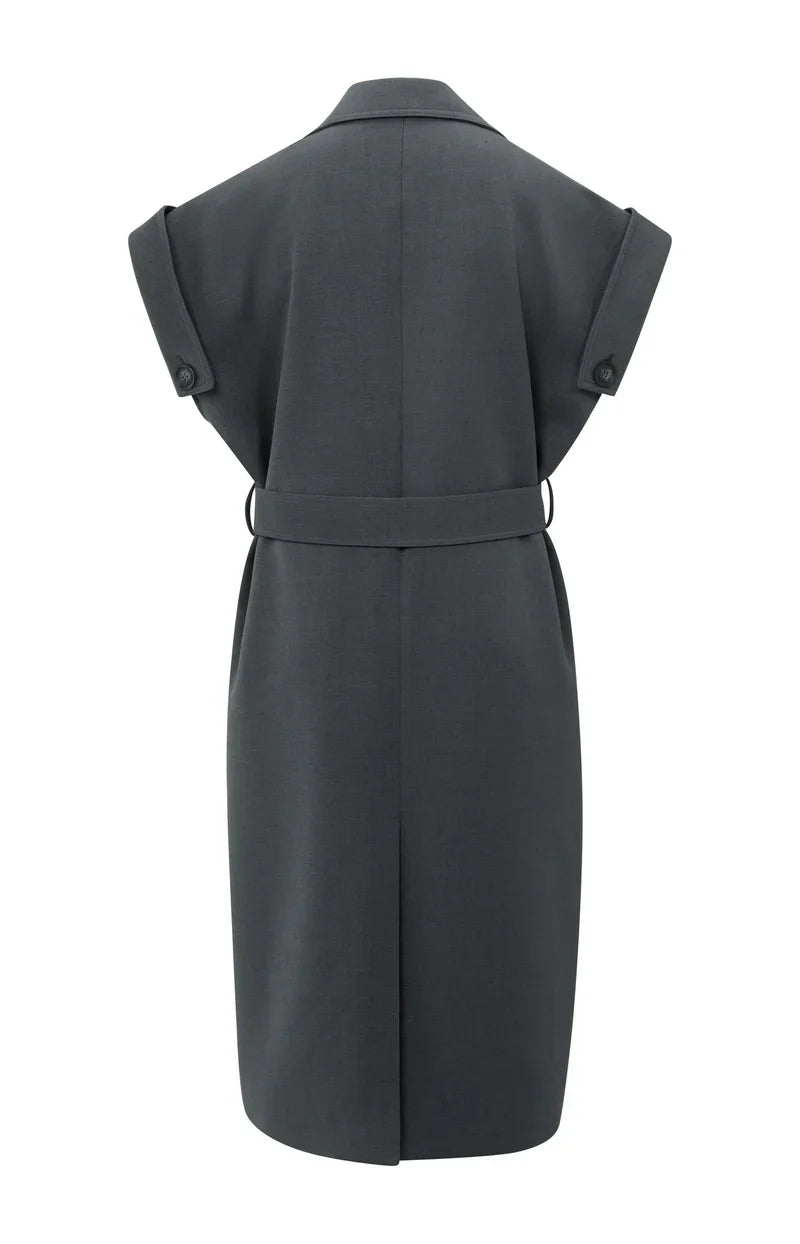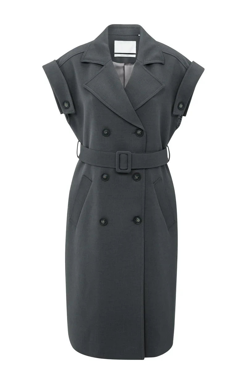 Ce trench sans manches revisité allie structure, féminité et modernité grâce à sa coupe ceinturée et son double boutonnage. Confectionné dans un mélange de matières raffinées, il sublime la silhouette tout en offrant un confort optimal.