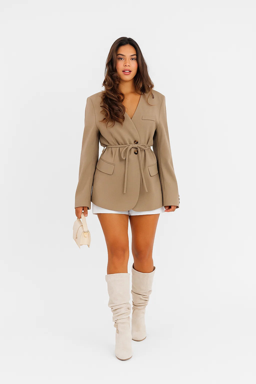 Cette veste saharienne taupe séduit par sa coupe ceinturée flatteuse et ses finitions utilitaires modernes. Elle est idéale pour structurer vos tenues avec une touche de sophistication décontractée.