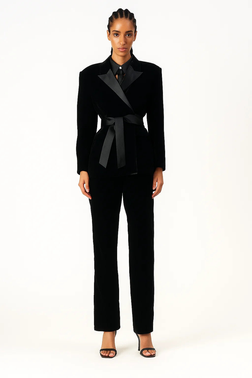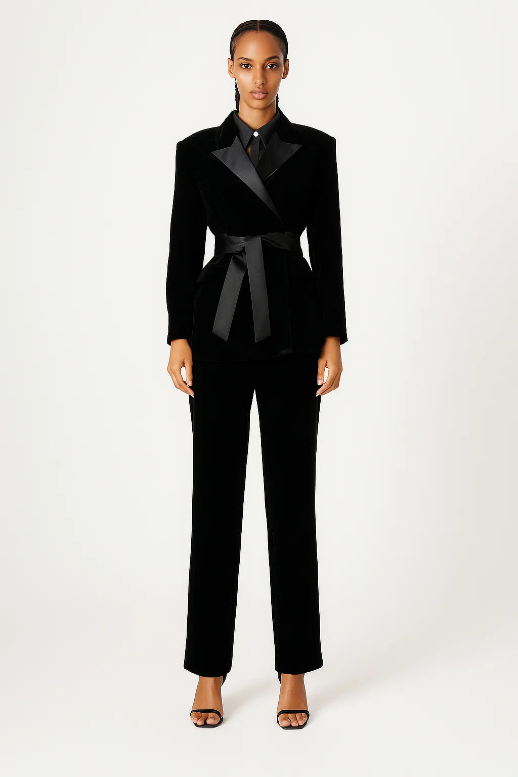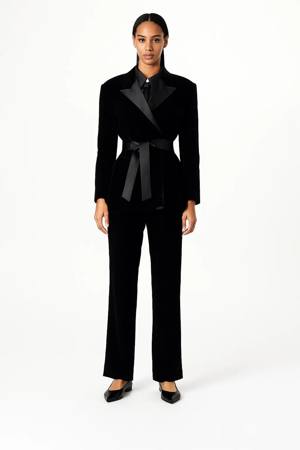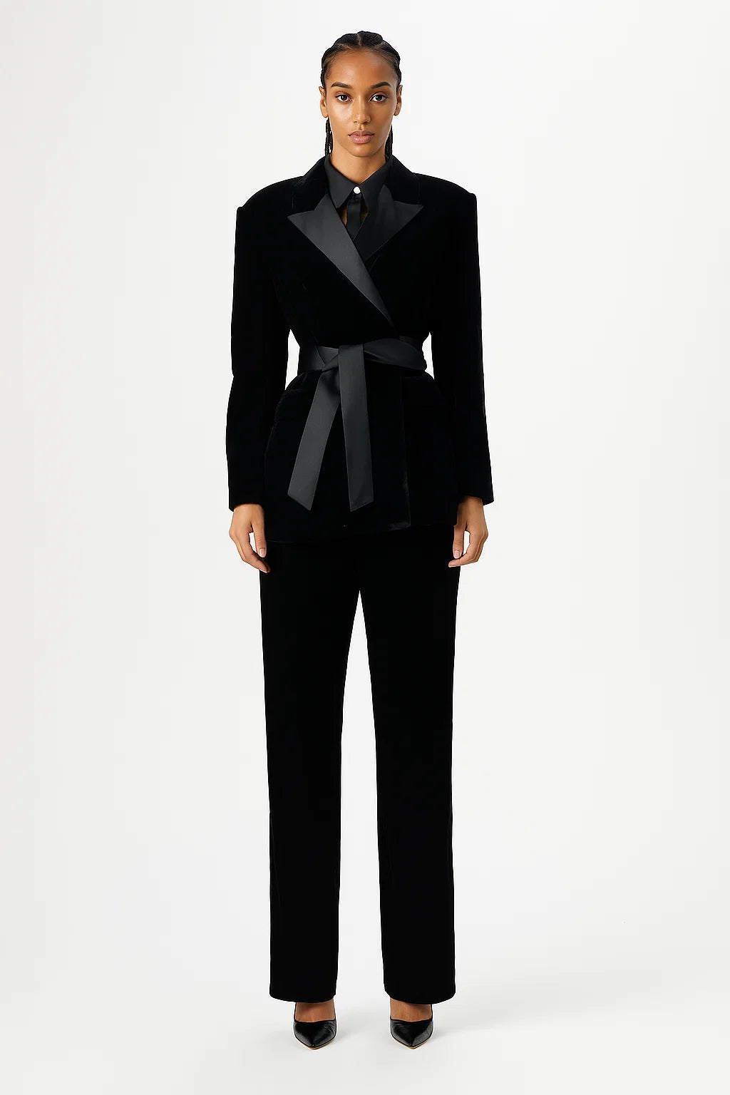 Cette veste noire en velours au style croisé avec ceinture satinée apporte une allure ultra sophistiquée. Sa coupe structurée et son tissu doux font d’elle une pièce forte et chic à la fois.